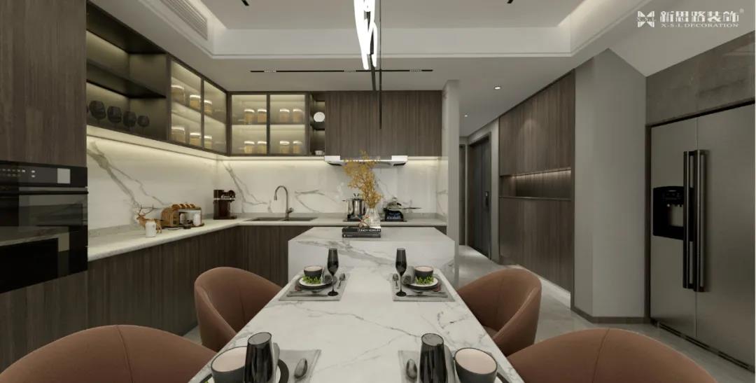 在會客廳的設計上,采用當下現(xiàn)代風格設計中流行的無主燈方案,配合超大的觀景落地窗,讓室內(nèi)的光線明亮柔和而不刺眼。色彩搭配上,選擇深淺結(jié)合的方式,深的是木紋、淺的是大理石和皮質(zhì)沙發(fā),組合出略帶奢華、但又低調(diào)內(nèi)斂的空間氛圍。