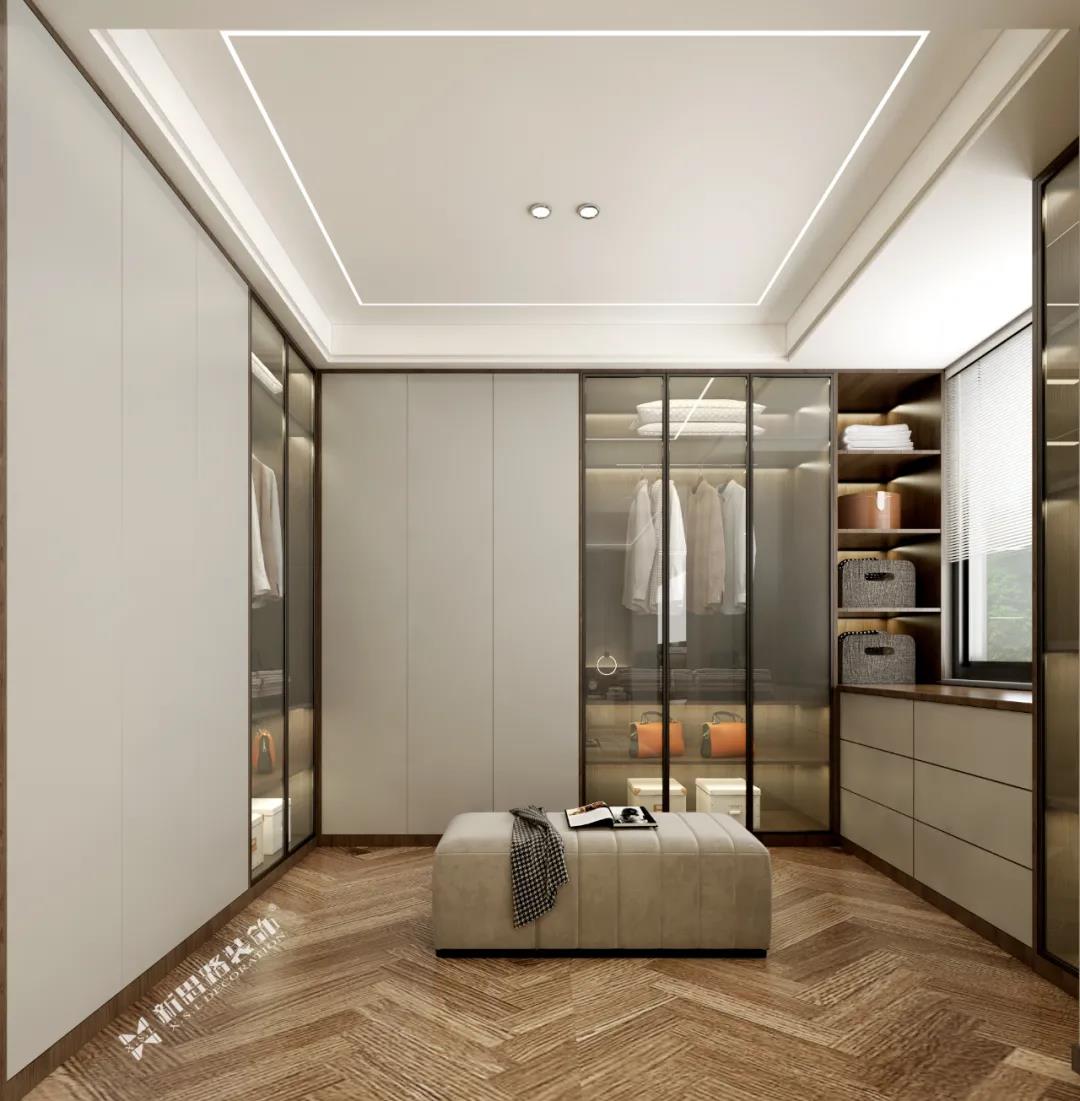獨立的步入式衣帽間面積寬闊,設計較多的柜子并進行多種分區(qū),方便客戶在此進行更衣和儲存。部分柜體采用玻璃門的設計,通透、有質(zhì)感。比較高的換鞋凳是出于客戶的年齡的考慮,也是人性化設計的體現(xiàn)。
