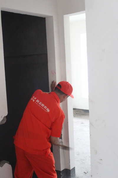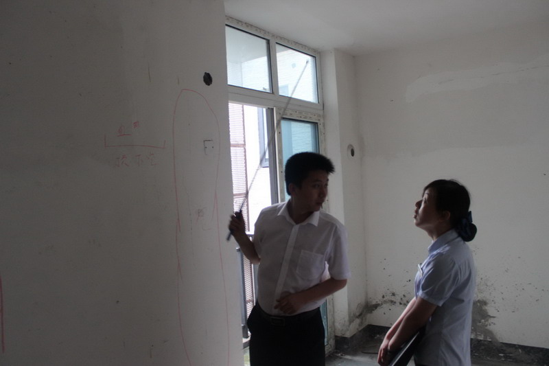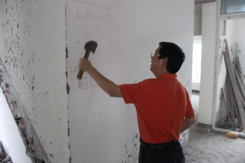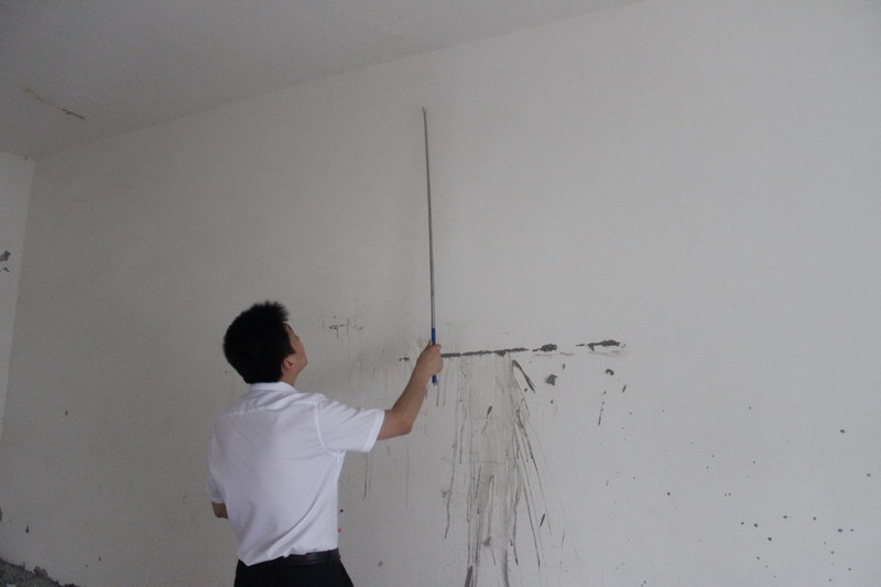 工程質(zhì)檢正在仔細(xì)檢查墻體有無空鼓情況。