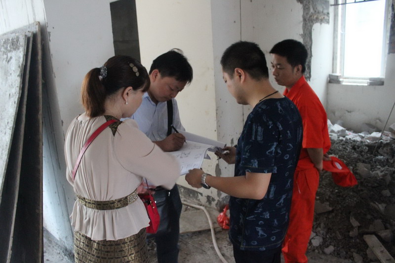 設(shè)計(jì)師對(duì)照?qǐng)D紙,跟電工師傅詳細(xì)溝通電線走位的一些細(xì)節(jié)。