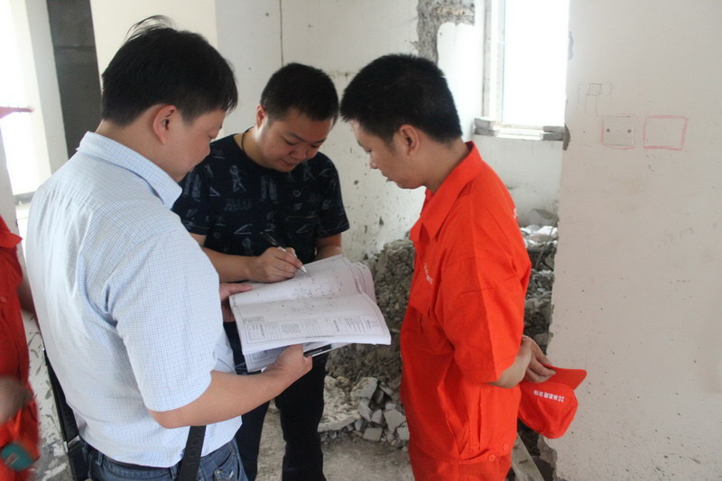 工長(zhǎng)和工人師傅對(duì)照?qǐng)D紙,認(rèn)真討論電線的排版、走位;插座組數(shù);強(qiáng)弱電箱安裝位置等細(xì)節(jié)。