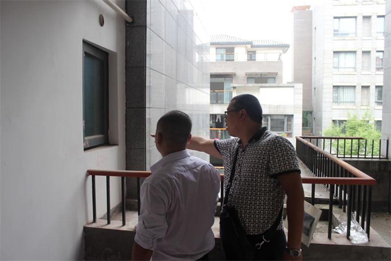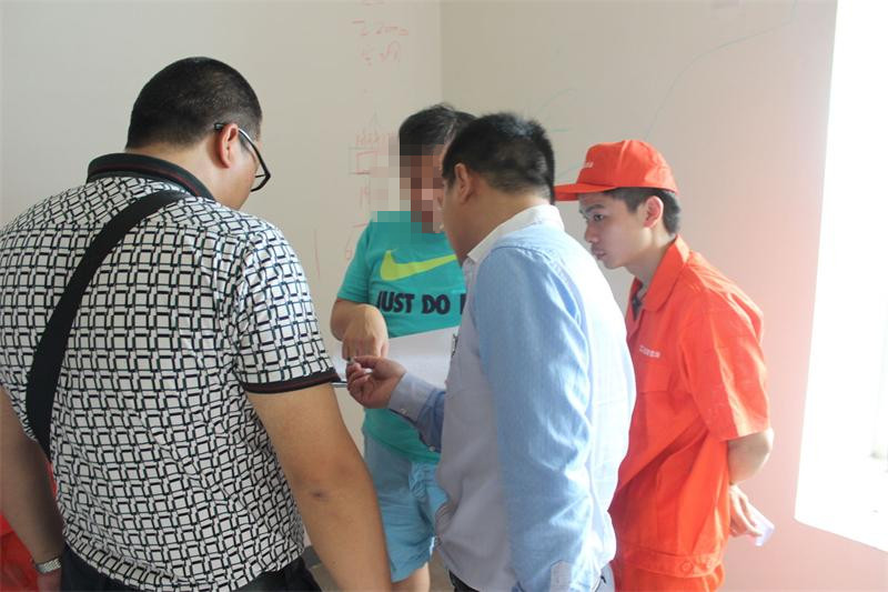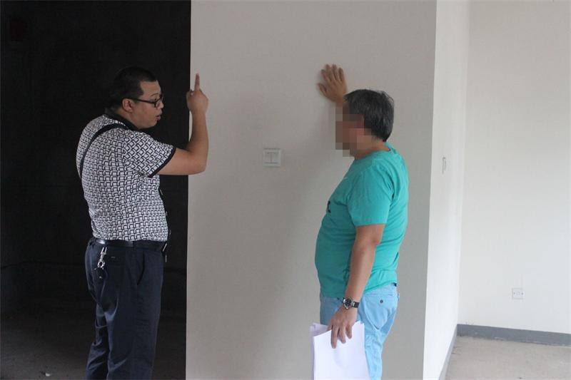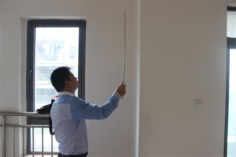 工程質(zhì)檢正在認真檢查墻體是否存在空鼓情況。出現(xiàn)空鼓問題的,質(zhì)檢會立即向物管反應,督促物管及時解決問題。