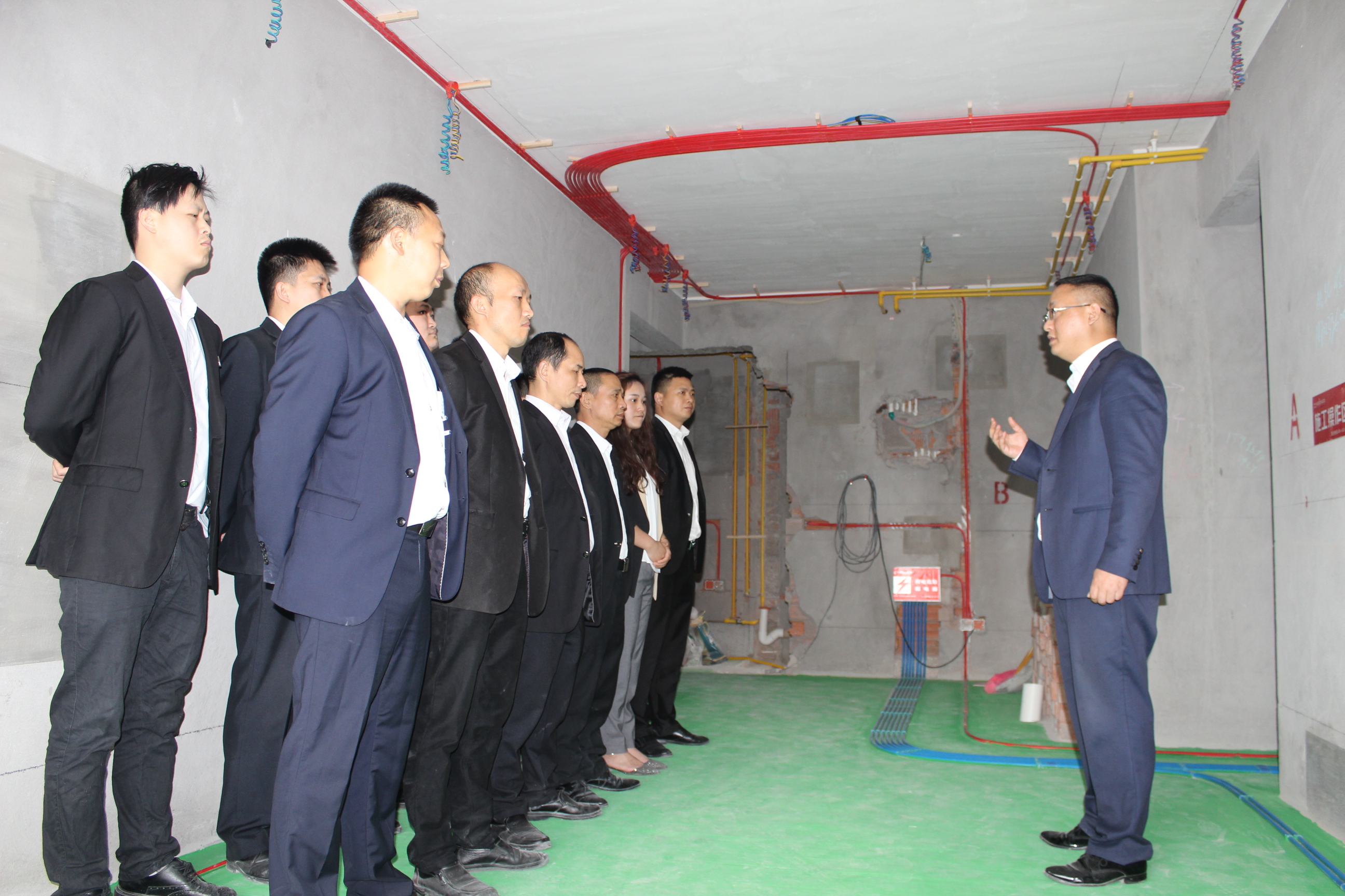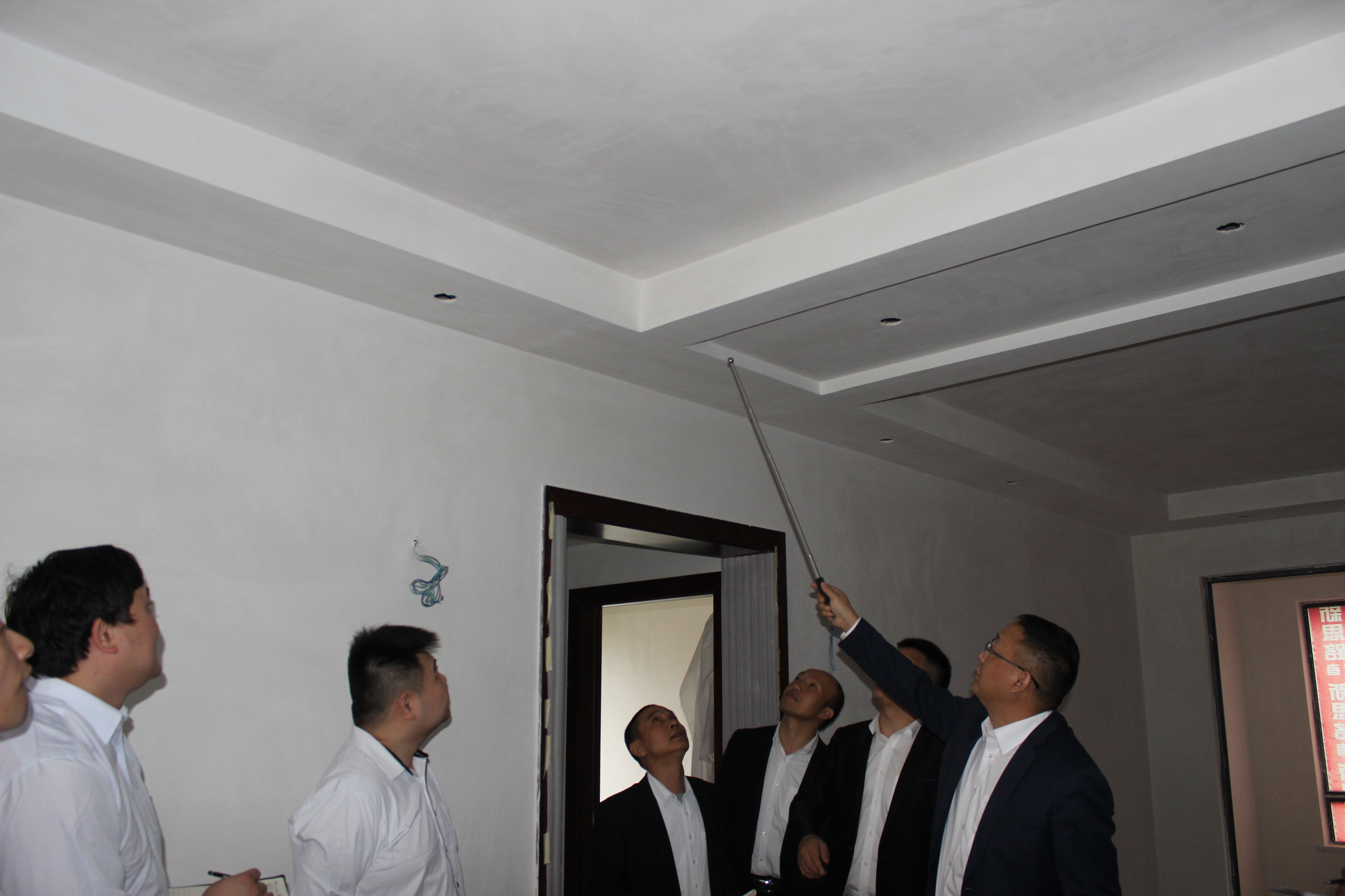 文經(jīng)理正在給項(xiàng)目經(jīng)理、工程質(zhì)檢分析吊頂工藝