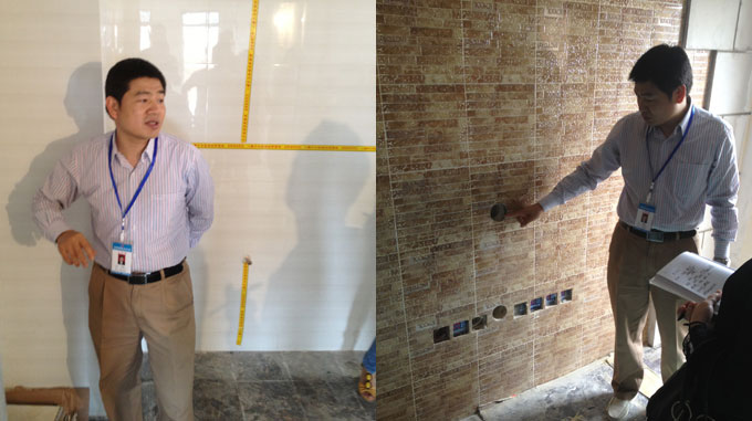 首先,我們來(lái)到位于沙坪壩濱江路的華宇金沙時(shí)代小區(qū)。到達(dá)施工現(xiàn)場(chǎng)正值漆工師傅緊張有序的施工,我們首先對(duì)泥作工藝進(jìn)行了查看,瓷磚的平整度、接縫差等一系列進(jìn)行了檢驗(yàn)。張總就工藝細(xì)節(jié)與大家共同探討,并在現(xiàn)場(chǎng)提出工藝上的問(wèn)題,大家都積極的回答。當(dāng)即張總指出,我們的每一位員工都要對(duì)我們的施工工藝清楚的了解到,并如實(shí)的告知客戶。這樣才是真正讓客戶明明白白裝修。