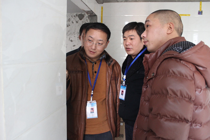 巡查小組在認真探討墻面貼磚工藝細節(jié)
